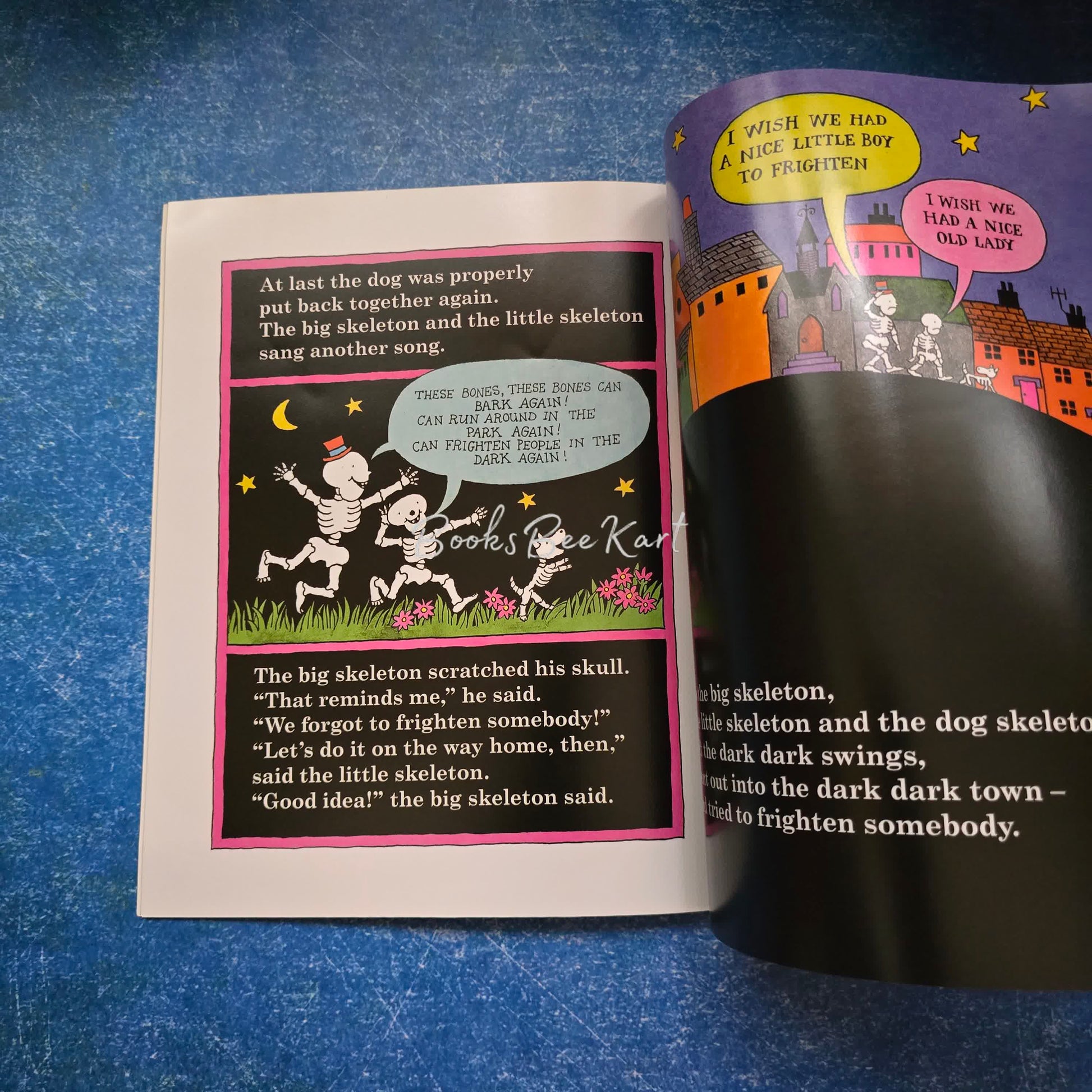 Janet and Allan's frightfully funny Hallowe'en classic tells the story of three skeletons - a big skeleton, a little skeleton and a dog skeleton - who venture out of their cellar one night to find someone to scare, only to find that everyone is in bed. Who will they scare now?!